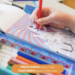 Take coloring to the next dimension. Create awesome optical illusions using a mix of warm/cool colours. With the pair of included 3D glasses on, watch as artwork pop off the page (*3D glasses make warm colors appear closer and cool colors appear further away). Neatly packed in our compact magnetic sealed case perfect for kids on the go.
