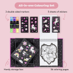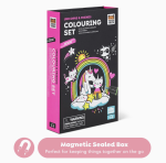 Kids will love this coloring set featuring Unicorns and magical fantasy worlds. Black pages make coloring within the lines a breeze and neon markers deliver vibrant results. Includes 3 double sided neon markers (6 colors) and 40+ stickers Complete in our sturdy, magnetic-sealed case perfect for kids on the go.