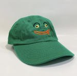 Green Frog embroidered kids dad hat with an adjustable strap in back. 6 1/2" - 7 1/4" (Age range: 3 years to small adult) 100% cotton, bio-washed chino twill