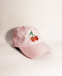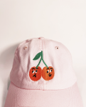 Pink cherry embroidered kids dad hat with an adjustable strap in back. 6 1/2" - 7 1/4" (Age range: 3 years to small adult) 100% cotton, bio-washed chino twill
