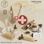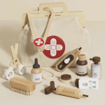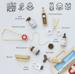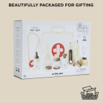 Our Animal Vet Set is the perfect companion for imaginary pet owners and animal lovers alike! This veterinarian-inspired set includes a vintage style storage medical aid bag, which is equipped with everything required to give any animal the best of care! Featuring a sleek walnut stain finish, the 10 accessories forming this set are unlike any others. Items included are; soothing paw balm, ear drops, medicine bottle, pet shampoo, stethoscope, dressing scissors, a syringe and a soft brush. Bring the world of career-based role play into any home with this perfect play set. Great for developing cognitive skills, dexterity and hand-eye coordination.